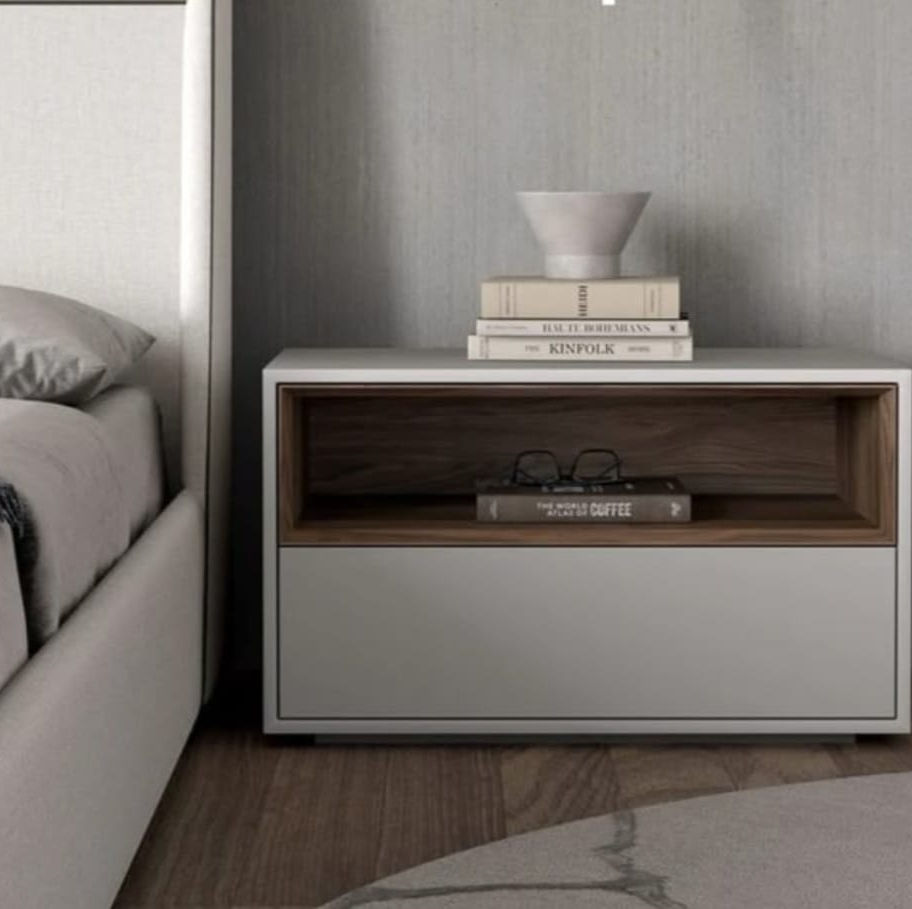 Introducing the Velario - Nightstand, a must-have piece of fine furniture from Masterworks. This unrivaled choice combines natural wood veneer with a dark or light grey body, exemplifying our commitment to exceptional design and craftsmanship. Elevate your bedroom with this sophisticated piece that seamlessly integrates with any décor. Trust in our expertise to bring a refined aesthetic and functional elegance to your bedroom .